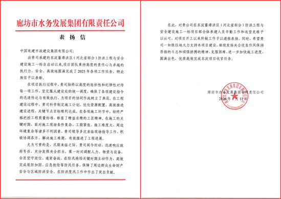 1月11日,东淀蓄滞洪区施工一标项目部收到业主单位表扬信,信中对项目部全体参建人员辛勤付出与攻坚奋进精神表示肯定,对项目开工以来扎实推进各项水利施工任务取得成效予以通报表扬。 自开工以来,项目部始终牢记“国之大者”使命担当,坚决贯彻落实各项工作要求,迎难而上、主动作为,全力推进工程建设。面对工期紧、任务重、气候多变及汛期施工压力大等多重挑战,项目部科学统筹资源配置,动态优化施工组织方案,全力保障工程高效有序推进;始终坚持“质量第一、安全至上”原则,严格执行水利工程施工规范,严控关键工艺流程,强化全过程质量与安全管控,尤其聚焦防洪度汛等关键环节,筑牢工程本质安全防线。在攻坚克难关键阶段,项目管理人员以身作则、靠前指挥,长期扎根施工一线、坚守岗位;全体建设者凝心聚力、奋勇争先,战高温、斗严寒,在汛期前完成多个关键节点任务,以实际行动充分展现新时代央企水利建设铁军过硬本领与责任担当。 此次表扬信获得,既是荣誉,更是鞭策。项目部将以此为契机,再接再厉,以更高标准、更实举措抓实抓细后续建设任务,全力保障项目高质量履约。 | ||||