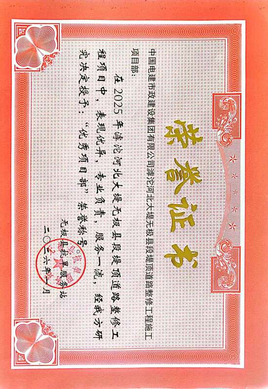日前,河北省滹沱河北大堤无极县段堤顶道路整修工程施工项目获“2025年度优秀项目部”荣誉称号,项目员工宋守章、张建军获“2025 年度优秀参建个人”荣誉称号。 该工程位于河北省石家庄市无极县,全长7.8公里,是保障区域防洪安全、改善群众出行的重点民生工程,主要建设内容包括道路拆除重建、排水槽修缮、护坡修复以及交通、照明等配套设施安装。项目建成后,原有道路存在问题得到彻底解决,堤防防洪保障能力和道路通行质量实现全面升级。 自项目启动以来,项目部全体人员攻坚克难、实干争先,克服线性工程点多面广、交叉作业协调难度大等挑战,以精细化管理为抓手,统筹推进施工组织与质量管控,最终实现375个单元工程全部合格、优良率达96%、原材料及实体质量抽检合格率100%。同时,项目团队高效完成设计变更优化,高标准实现建设目标,工程最终获评“优良”等级,并通过多方联合竣工验收,实现全部资金回款,完成工程建设与经营收尾双重任务。 下一步,项目部将以此次表彰为契机,系统总结优秀经验、强化管理效能,深耕品质工程,为地方发展与民生保障贡献更多力量。 | ||||